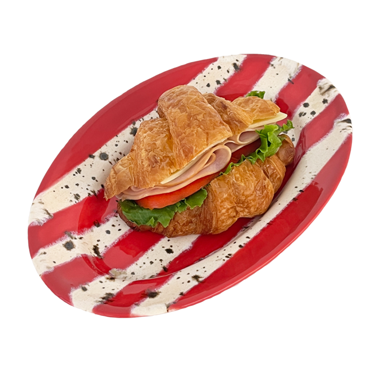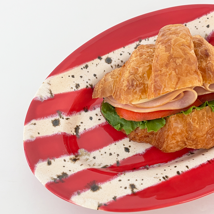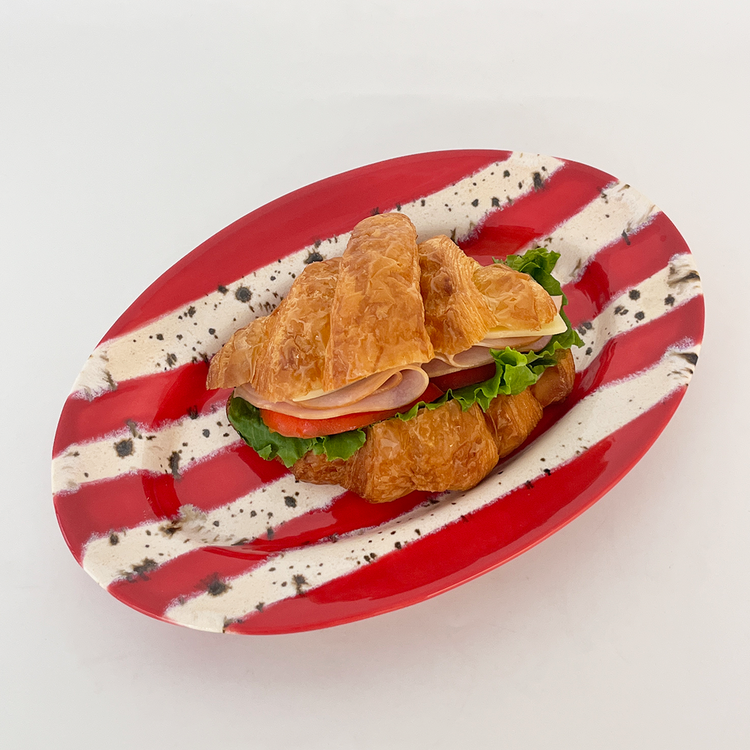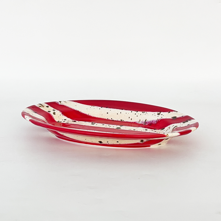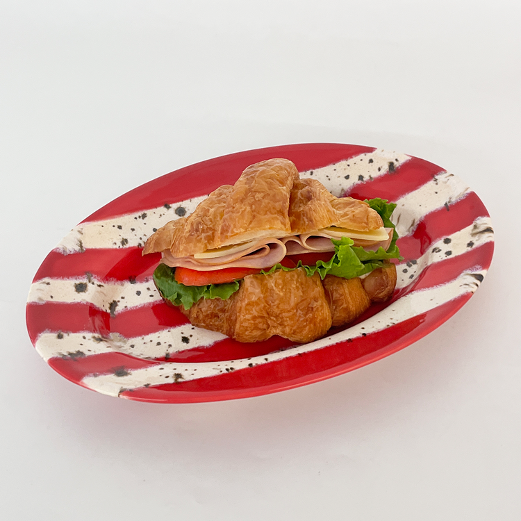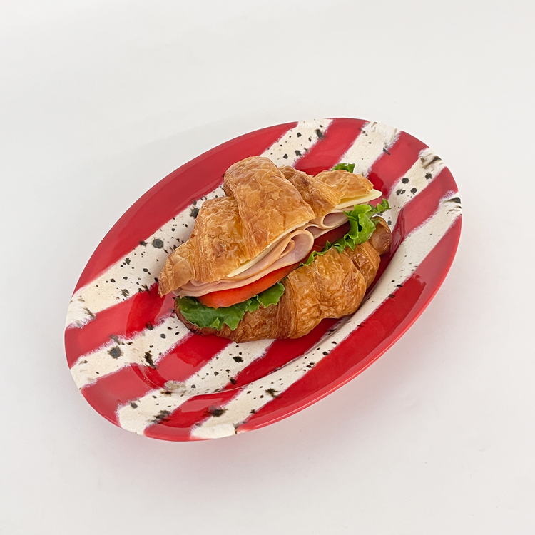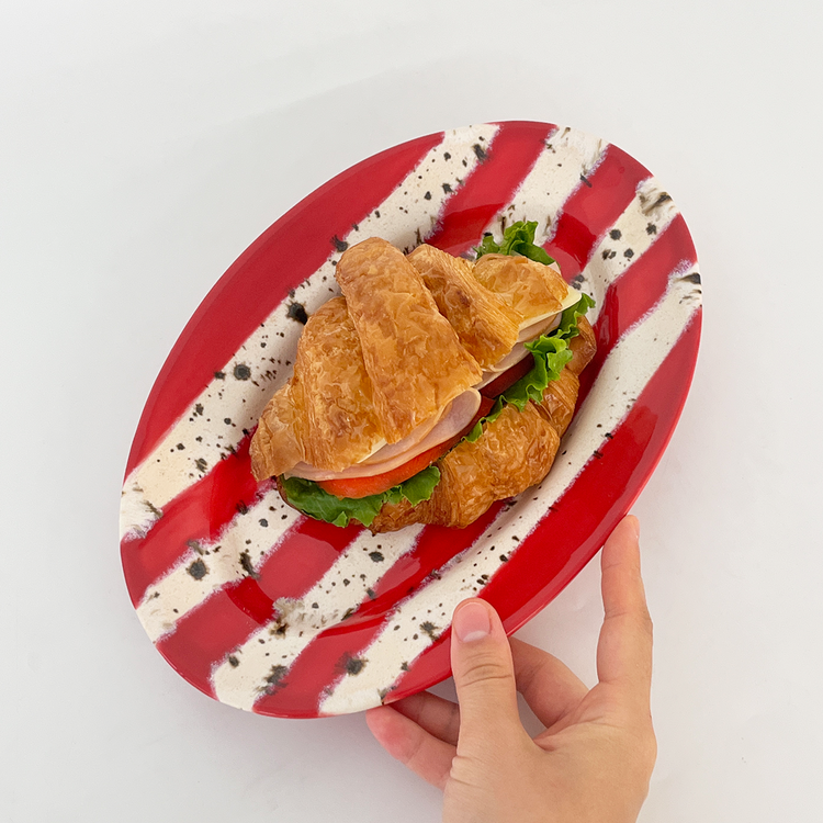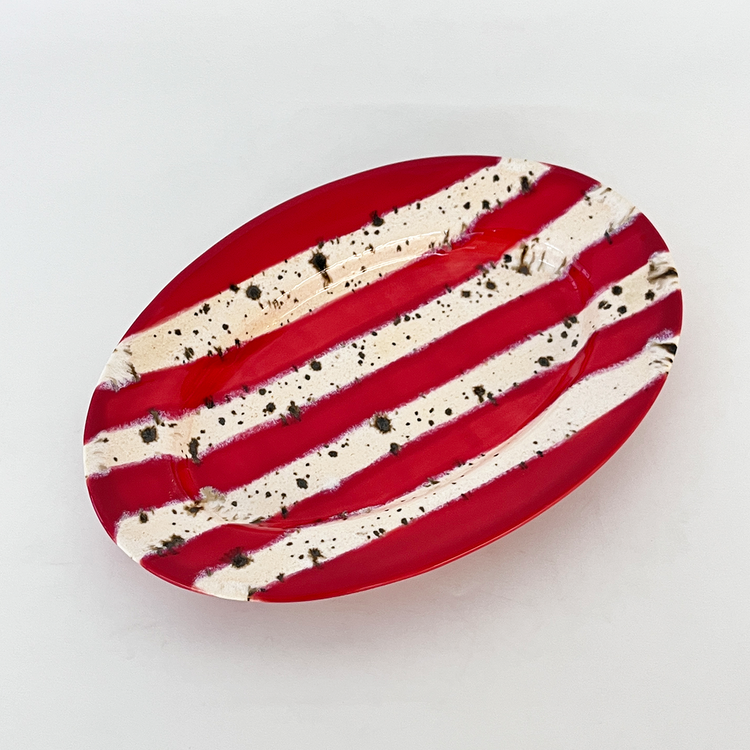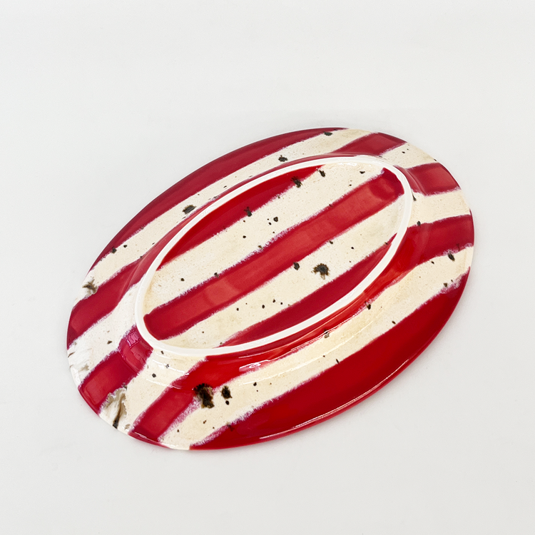 홀리데이 시즌을 맞이하여 제작한 오벌플레이트입니다. 포인트 레드컬러 줄무늬와 브라운 컬러의 점이 톡톡 묻어있는 베이지 줄무늬를 교차하여 장식하였습니다. 1250도의 고온으로 구워내어 안전하게 사용하실 수 있는 식기이며 어떤 음식을 담아도 미감을 해치지 않으며 잘 어우러집니다. 유약의 형태는 가마안에서 조금씩 더 녹거나 덜 녹아 자연스럽게 표현되어있습니다. 일률적이지 않아 매력적인 플레이트입니다.