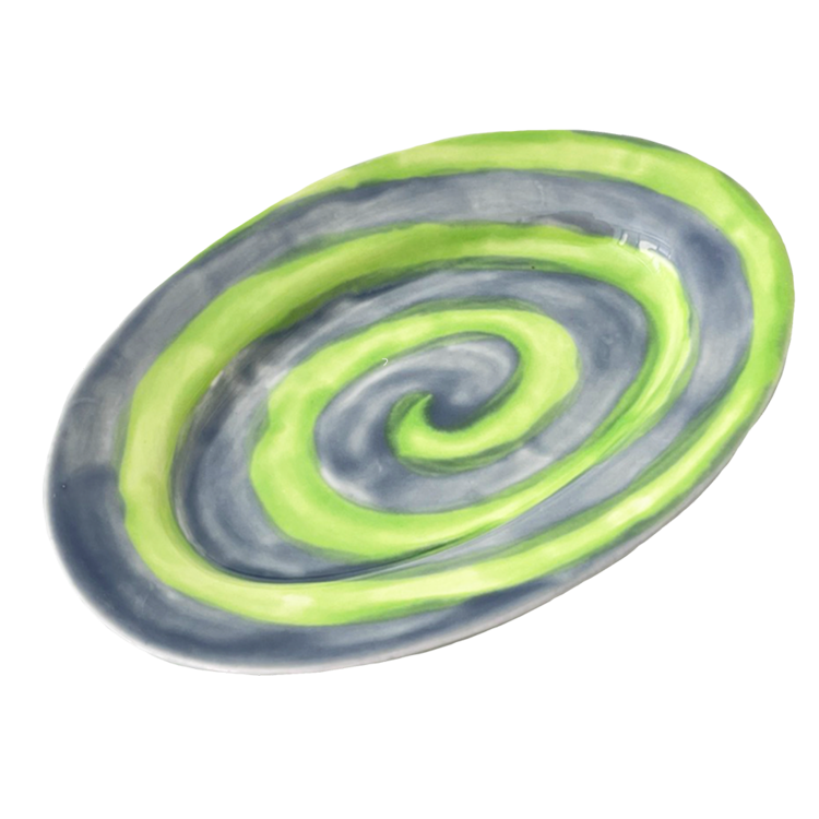 우주선을 떠올리게 하는 컬러감으로 제작한 오벌플레이트입니다. 밝은 연두색과 톤다운된 블루컬러를 소용돌이 모양으로 교차하여 장식하였습니다. 1250도의 고온으로 구워내어 안전하게 사용하실 수 있는 식기이며 어떤 음식을 담아도 미감을 해치지 않으며 잘 어우러집니다. 유약의 형태는 가마안에서 조금씩 더 녹거나 덜 녹아 자연스럽게 표현되어있습니다. 일률적이지 않아 매력적인 플레이트입니다.